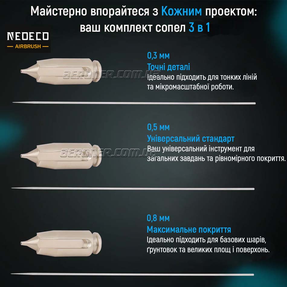 - В комплекте идут три набора сопло+игла: 0,3 мм, 0,5 мм и 0,8 мм.