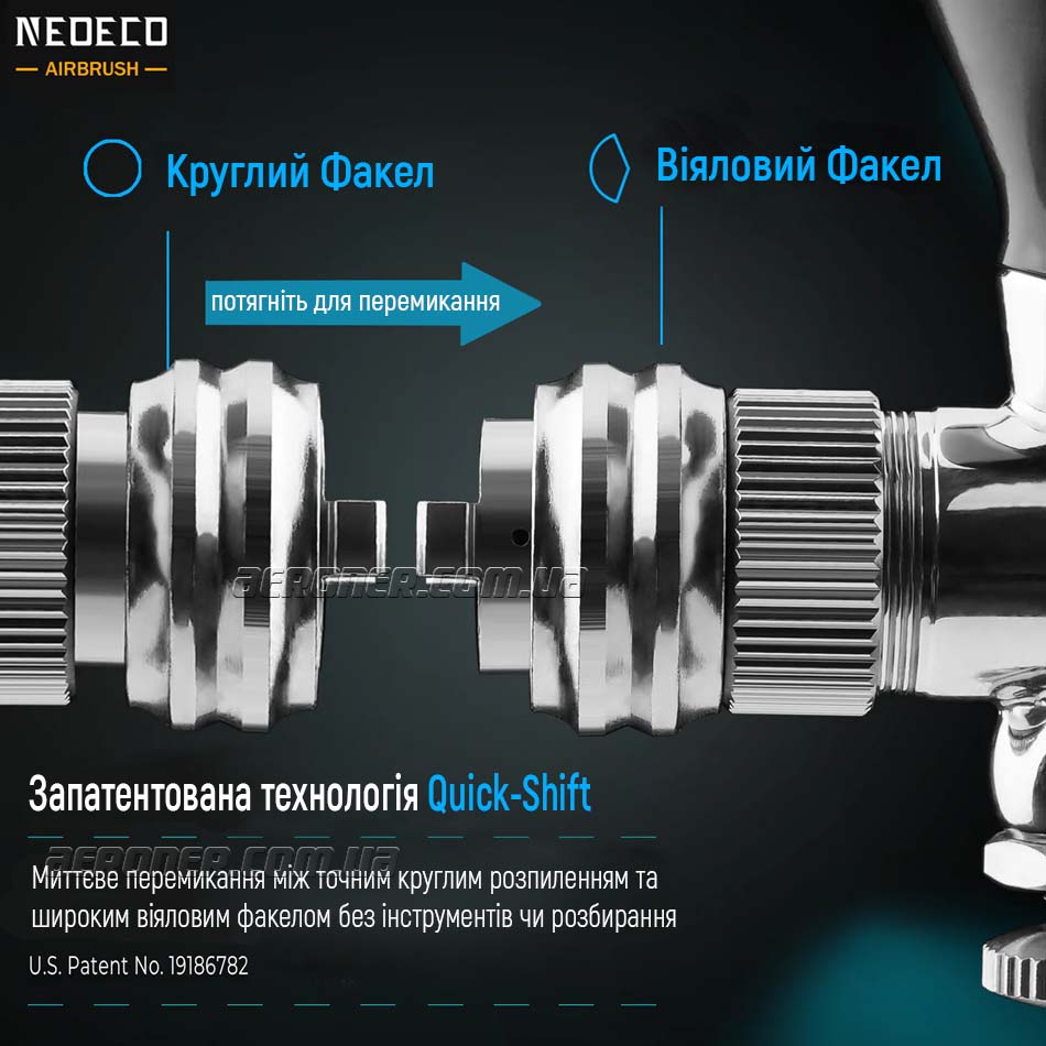 - Технология «Quick-Shift»: позволяет за ~1 секунду переключаться между режимом Веерного (Fan) и стандартного Круглого (Round) распыления без инструментов или разборки аэрографа.