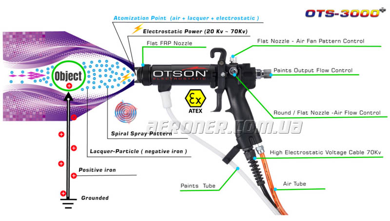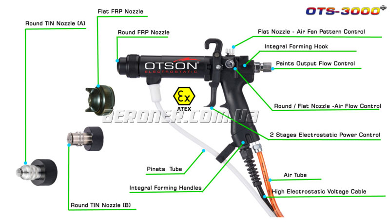 Электростатический краскопульт Otson OTS-3000 предназначен для нанесения лакокрасочных материалов на сольвентной и водной основе.