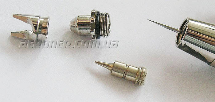Улучшенная комплектация аэрографа включает в себя две крышки для бачков (которых не было в предыдущей версии), а так же два сопла и две иглы.