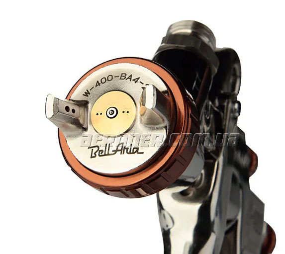 В техническом плане, корпус Bellaria, как и у всех моделей 400-й серии, одинаковый, но отличается чуть большим кольцевым зазором и большим диаметром малых отверстий в дюзе. Таким образом, инженеры Anest Iwata увеличили количество проходящего воздуха, при меньшем давлении. Проще говоря, немного сместили в сторону HVLP системы, для более качественного нанесения базовых материалов.