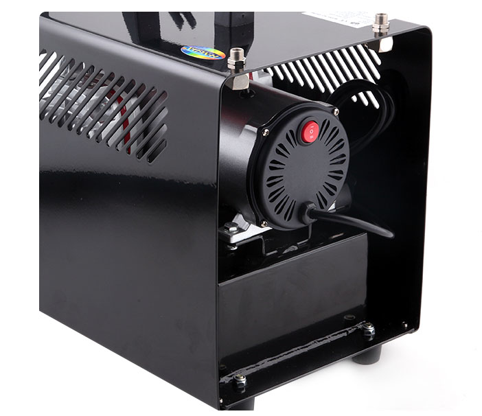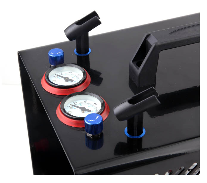 Главное преимущество этого миникомпрессора — два отдельных выхода для одновременного подключения двух аэрографов. Каждый выход оснащен своим регулятором подачи воздуха и манометром. Мощный двигатель в связке с 3-х литровым рессивером позволяет работать как с одним, так и с двумя аэрографами одновременно, легко использовать большие сопла для более густых материалов. Рессивер убирает все пульсации напрочь.