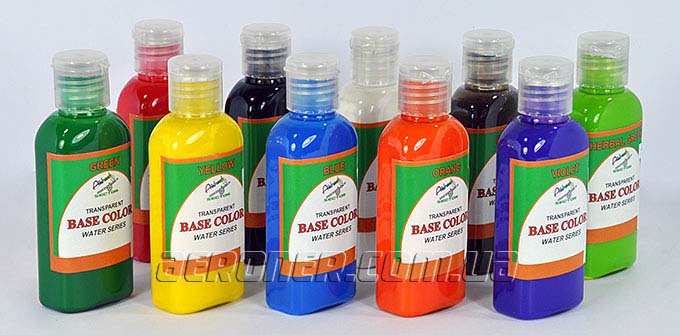 Серия красок Transparent отличается от стандартных базовых укрывистых цветов меньшим содержанием пигмента. Эта краска с успехом применяется в аэрографии для создания плавных переходов между цветами, создания мягких контуров, полупрозрачных теней и бликов. Так же возможно создание основного рисунка.