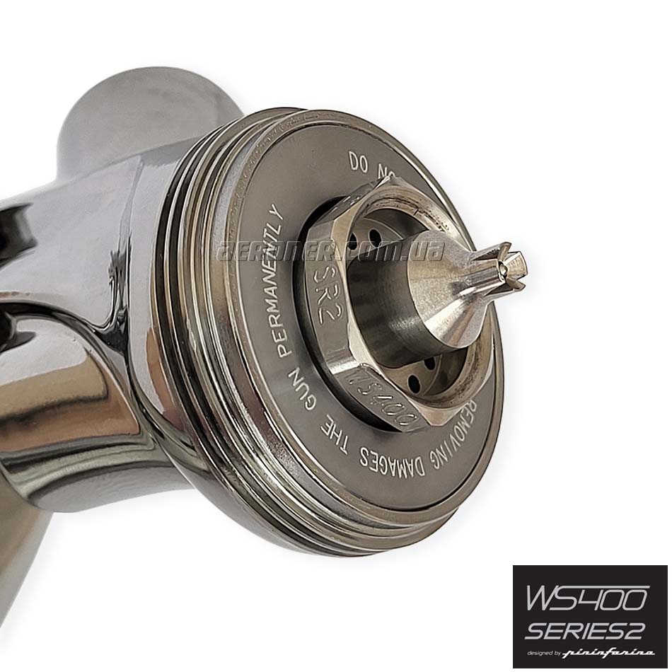 Доработанная поверхность воздушной головы краскопульта Iwata WS-400 SR 2 – приняла более округлую и коническую форму для еще лучшей аэродинамики и дробления краски (преатомизация).