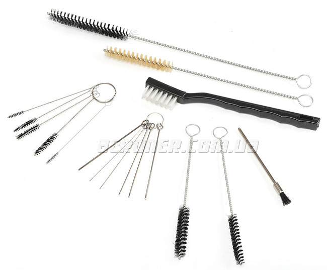 Набор для чистки краскопультов состоит из 17 профессиональных и необходимых предметов: щеточки, ершики, иглы.