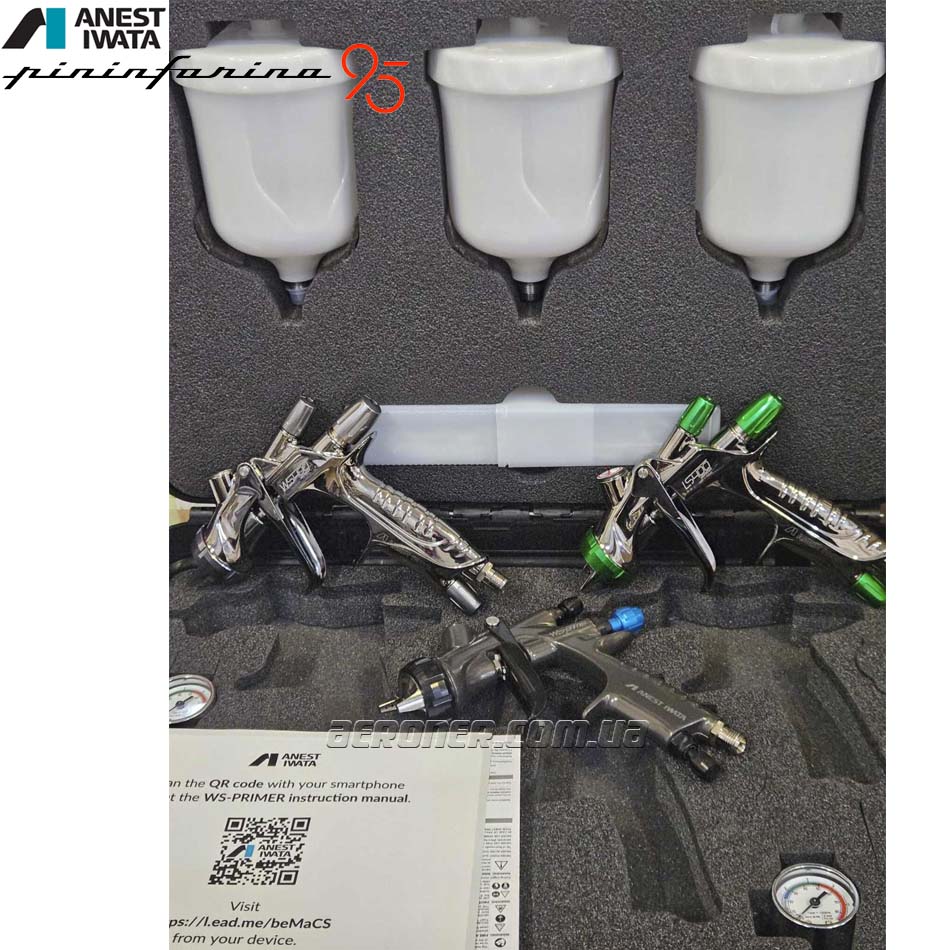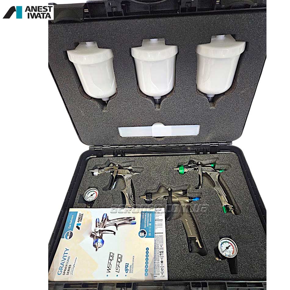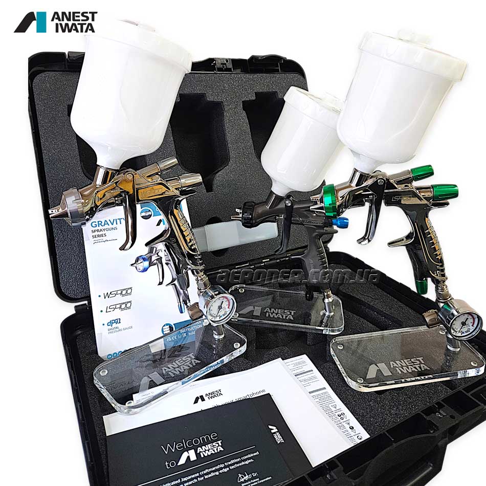 - Iwata LS-400 SR2 Base 1,3 мм + манометр с регулятором Iwata HVC — для нанесения самых сложных базовых материалов,