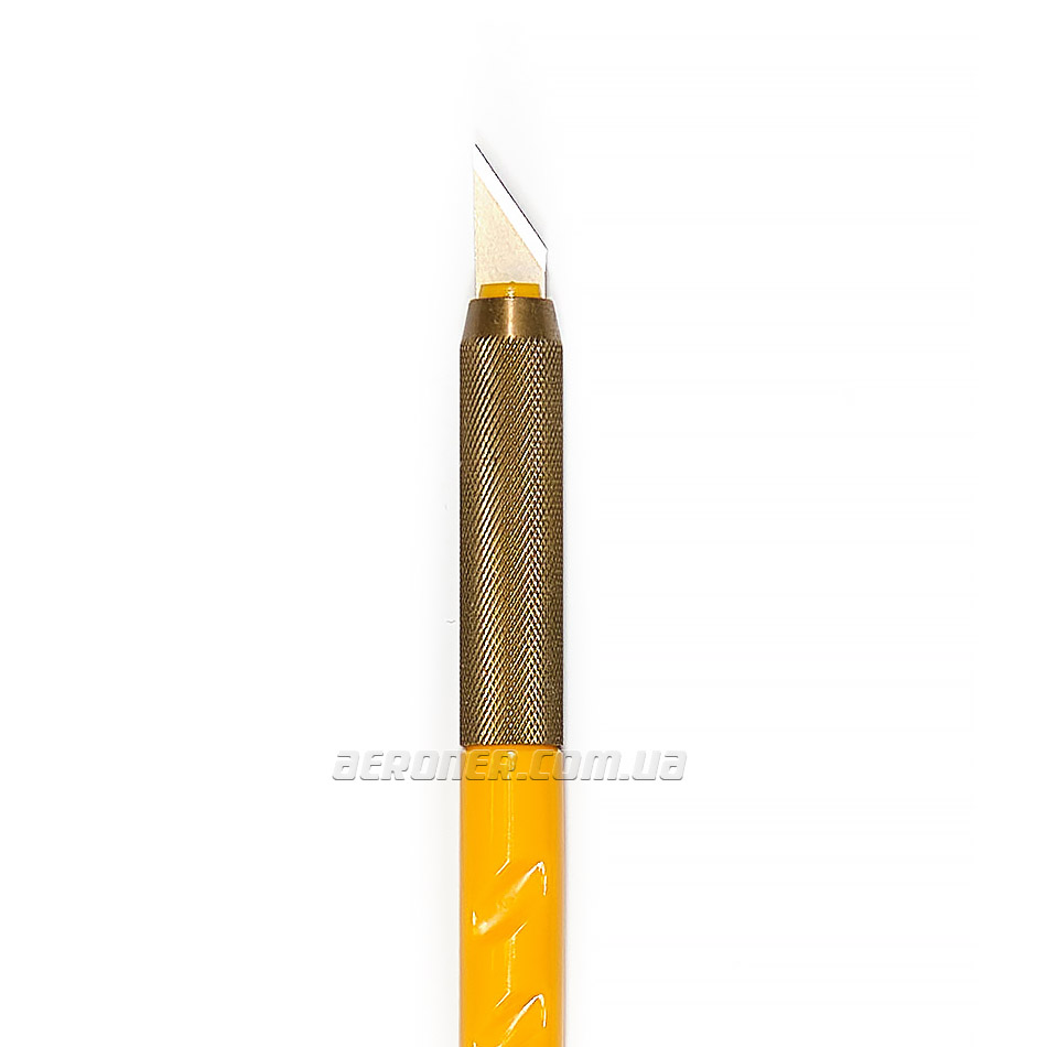 Профессиональный дизайнерский нож с фасонной рукояткой из ударопрочного пластика. Нож имеет цанговый зажим, который обеспечивает быструю смену и крепкую фиксацию лезвия.