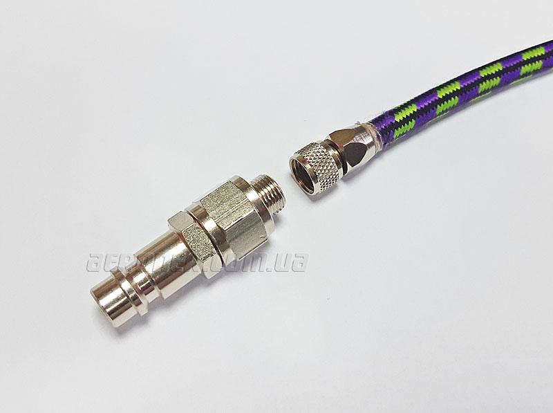 Переходник предназначен для присоединения аэрографического шланга с резьбой 1/8″ к большим промышленным компрессорам, оснащенным на выходе быстросъемом «мама» 1/4″.