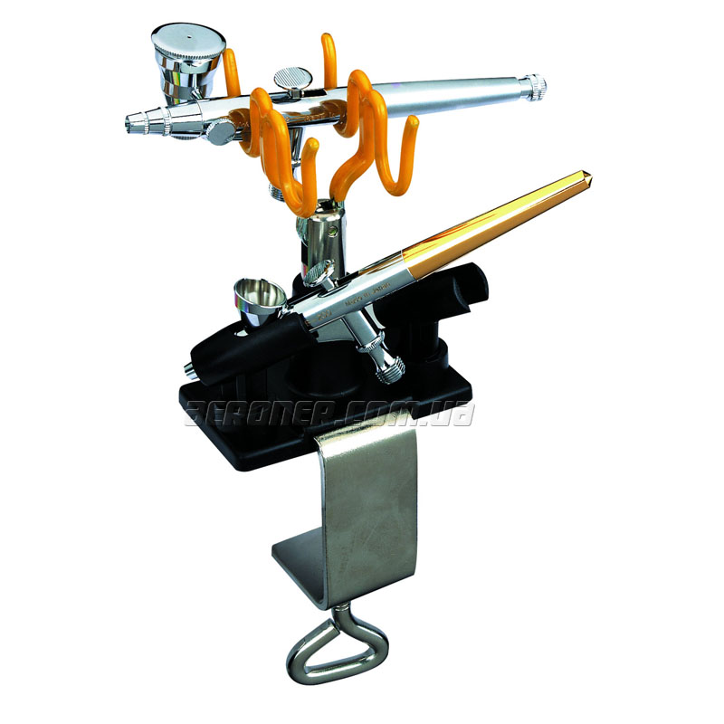 Такая подставка позволяет надежно удерживать до 4-х аэрографов. Есть держатели разного вида, которые могут фиксировать аэрографы любого типа.