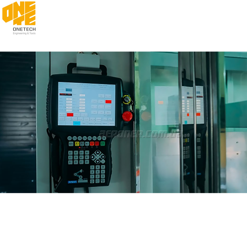 - Сенсорный дисплей с процессором позволяет управлять пневматической поворотной двухпозиционной подачей, работой краскопультов, регулирует скорость движением манипулятора, показывает индикацию неисправности, отображает рабочее состояние и т. д.