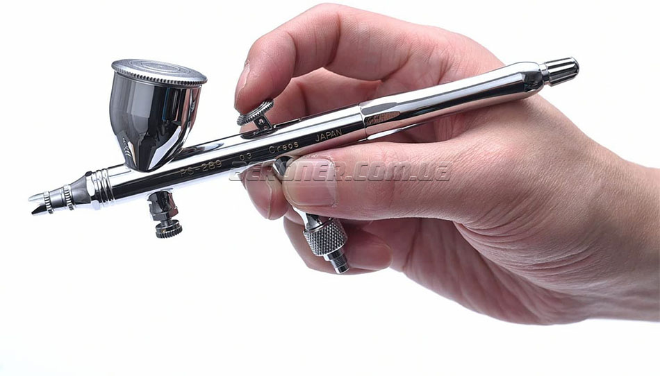 Распылительный узел аэрографа (воздушная голова, сопло, защитный колпачок) изготовлен идентично с топовыми моделями GSI Creos Mr.Air Brush Custom 0.18 PS-770 и Iwata CM-C Plus.